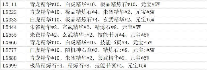 lx666:官职令牌x10,特殊锻造石x10,超级祝福油x5,红名清洗卡x3